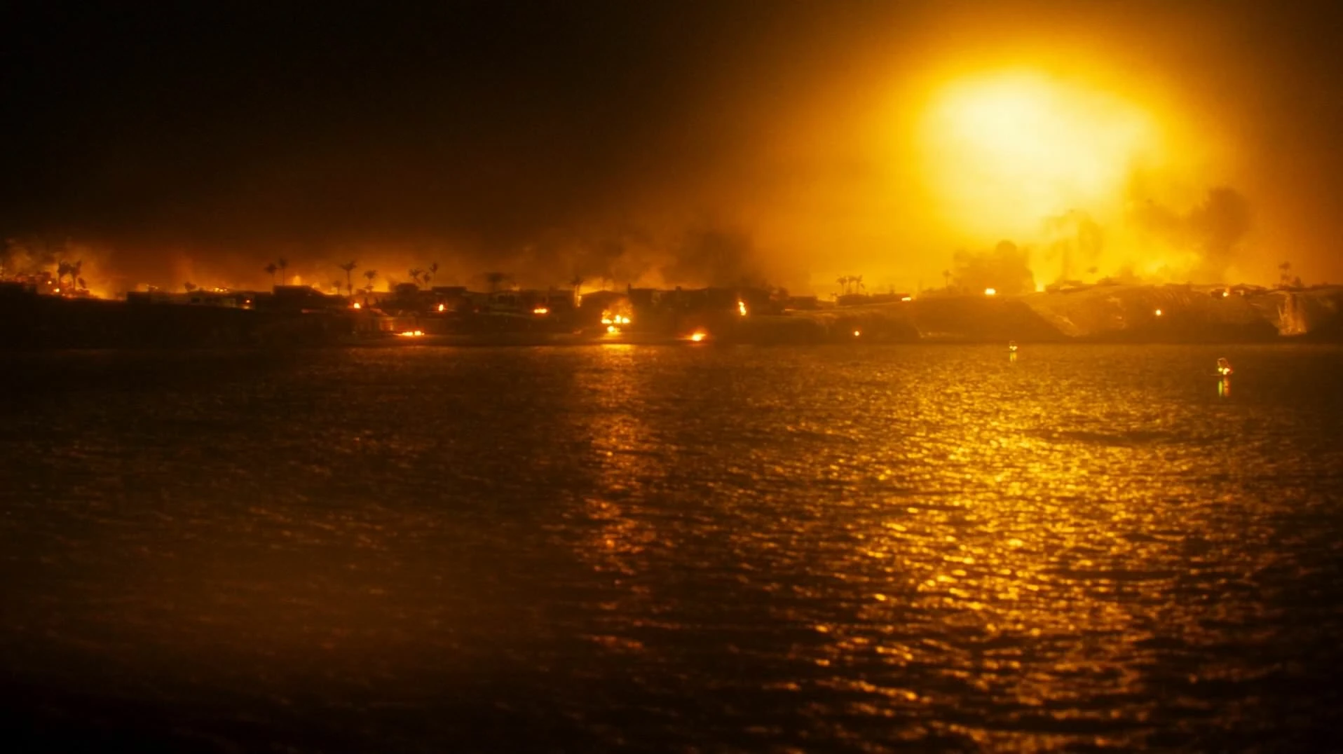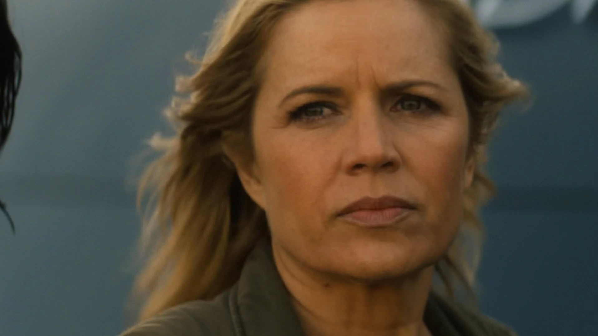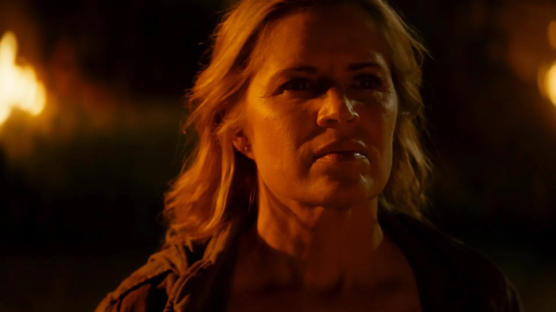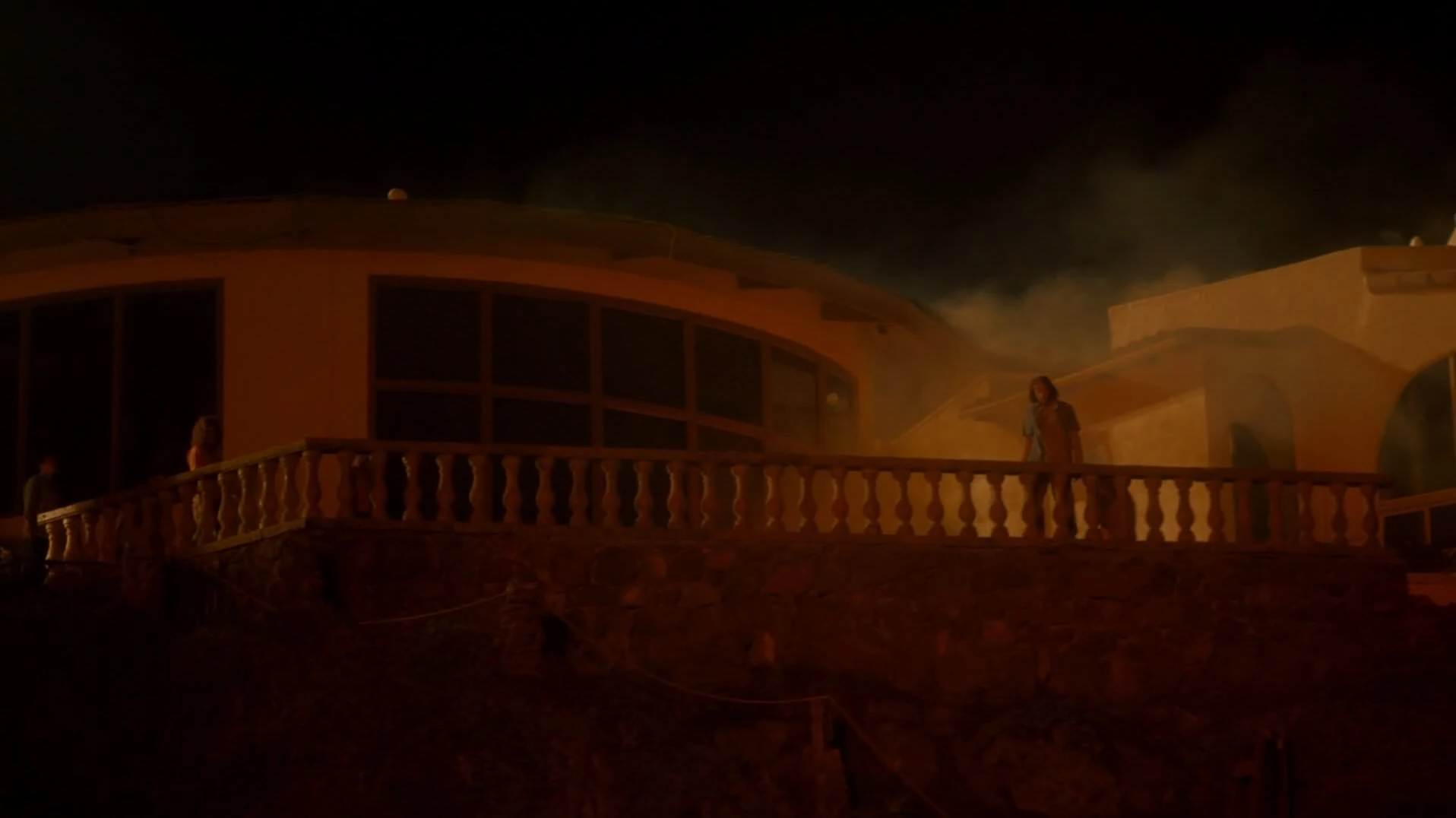 Travis puts Liza's body in a stateroom and the group look back at LA burning as they sail away, military jets are bombing the suburbs, everything they can see is burning.