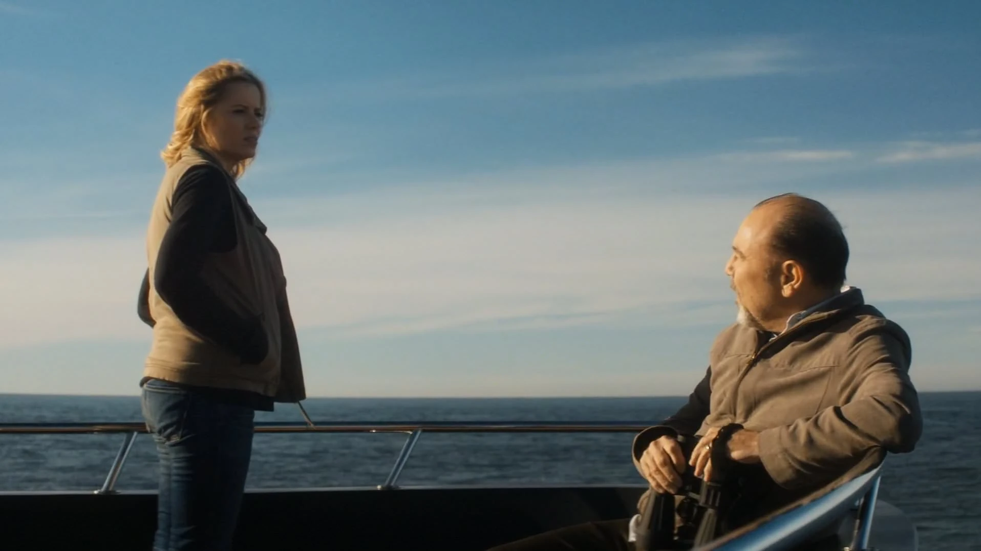Liza's funeral and everyone is gathered around, Travis speaks for a while, Chris can't contain his emotions and tips her body into the sea with no warning. He goes down into a stateroom, Chris and Travis argue, it ends when Chris hits his father