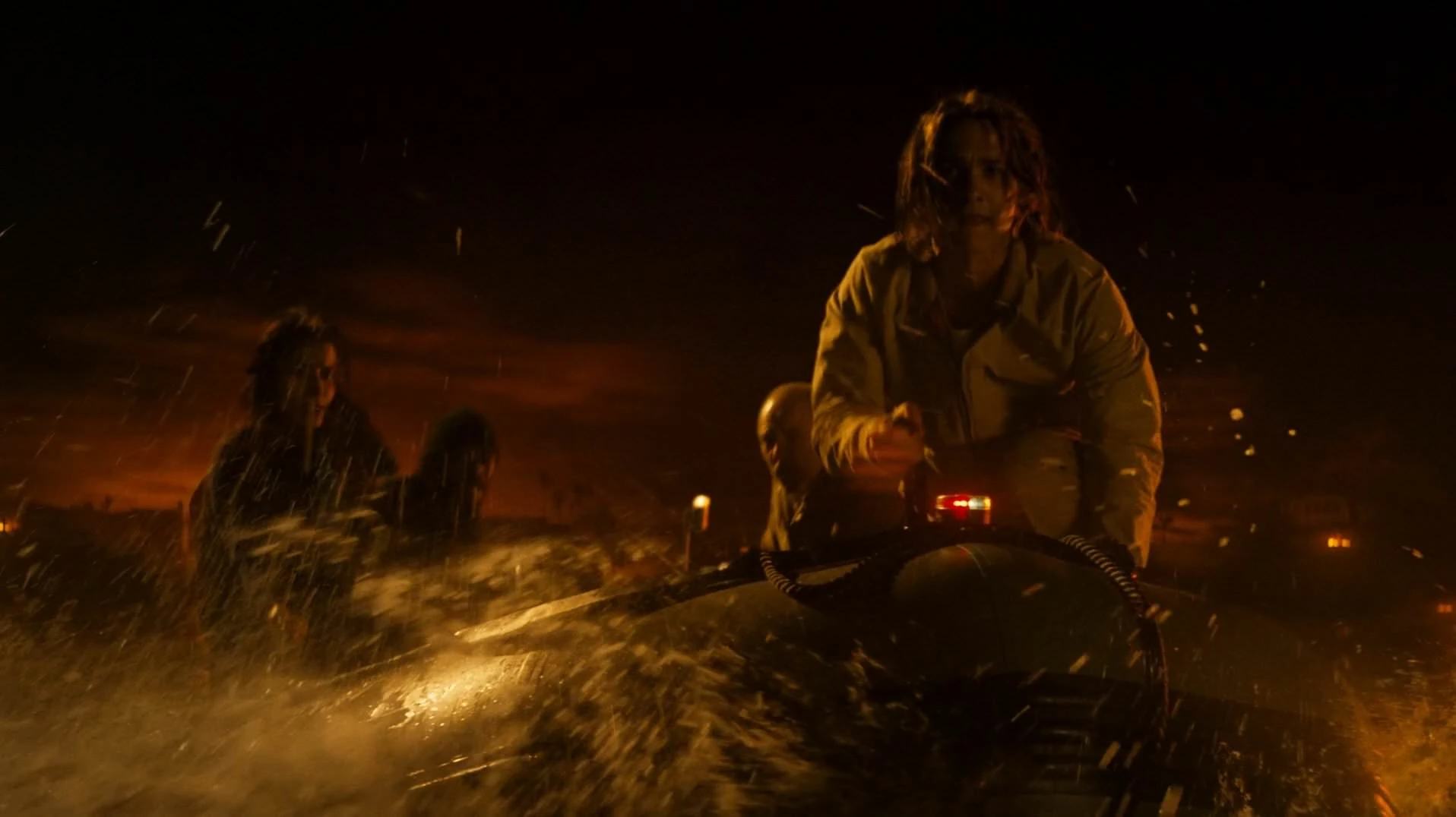 Maddy, Travis & Chris on the beach with Liza's body wrapped in a sheet, and their luggage. A small Boat (a Zodiac) is heading out to The Abigail with Nick, Alicia, Ofelia, piloted by Strand