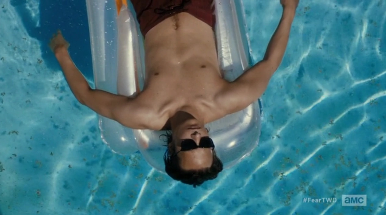 Madison goes out to the pool to give Nick his Oxycontin that he's forgotten to take. Somehow. He says he doesn't need it anymore, says to give it to Griselda. Eventually she gives up, tells him not to be a hero and walks back in, says to enjoy his swim.