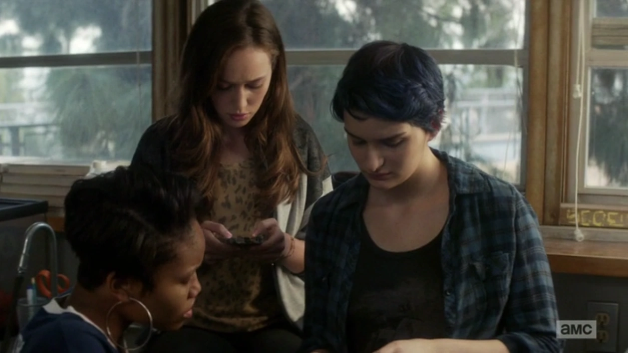 Madison probes a little, to find out what's happening that's made him want to carry a knife. When Madison warns he could be expelled and risk his future at college Tobias replies “No one’s going to college. No one’s doing anything they think they are.” Madison asks what he’s talking about and Tobias tells about the news reports of a virus (or something) spreading in five other states, of people killing. Madison tells him to spend less time online; he doesn't get his knife back and leaves the change Madison planted in his pocket on the table as he goes.
