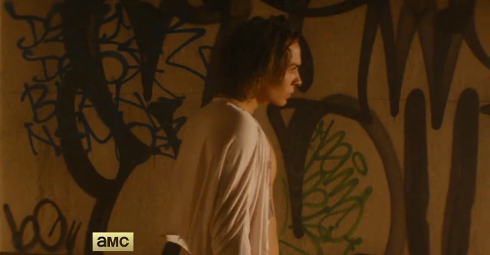 They get back in the pickup and Travis starts to reverse through the tunnel to the road. As he looks over his shoulder to steer he can see Calvin shambling towards them down the tunnel and both Travis and Madison get out to help him.