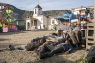 On land, Strand leads the group inland, they go inland far enough for some members of the group to be asking Strand if it's much further. They find a pile of dead parishioners in front of the church, the bodies are being eaten by a dog. Strand spots Thomas’s truck and calls Thomas’s name, he runs around in panic looking for Thomas and calling out for him. The group fight off a herd of infected parishioners who arrive because of the noise. Daniel grabs a young infected boy and is paralyzed by the memory of clutching a young boy by the neck on an earlier occasion. Ofelia puts the zombified boy down for her father. After he's put down her mother, Nick has to "kill" a young infected girl, the girl we saw in the church with her mother. Afterwards he just sits there, stunned.