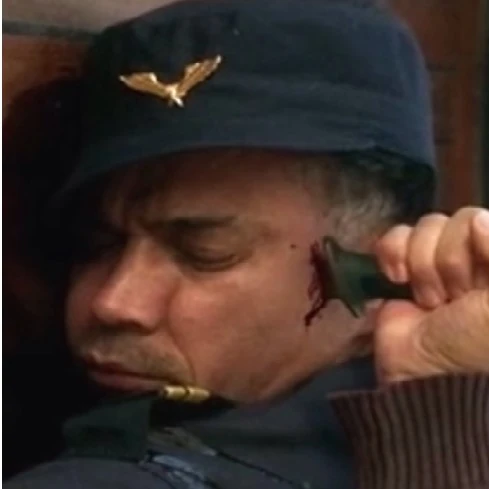 In Thomas' room Strand sits next to Thomas with a gun: Thomas has been shot in the head through a pillow, the two communion wafers are still where Celia left them.