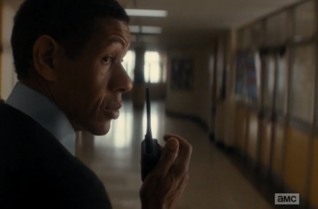 Madison goes back into the living area where Alicia asks her what has happened. Madison doesn't answer, it looks as though she wants to but can't bring herself to say it. We see the stairs at the school, Arty's 2 way radio and his body on the landing 1/2 way down.
