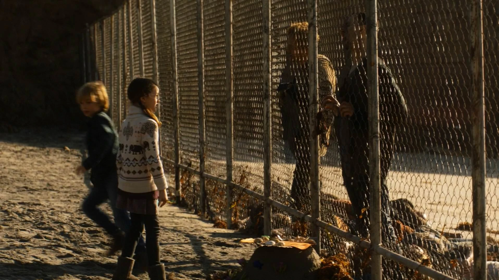 Eventually we see that the dead are separated from the children by a sturdy wire fence; they press up against it as the children bring their shells and rocks to show to the infected.
