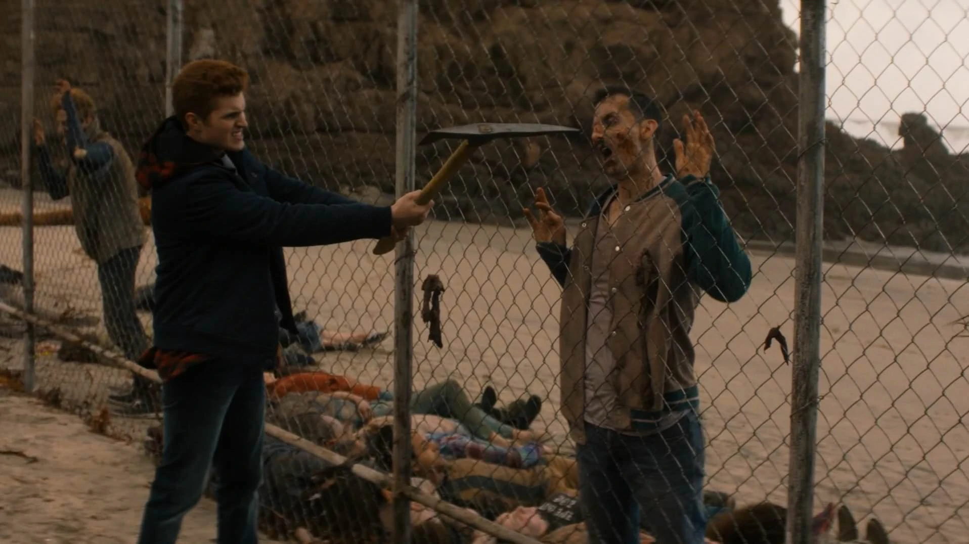 "Chores" turns out to be putting down the dead at the fence on the beach. This has to be done first thing in the morning, before lunch and at the end of the day. Chris has a turn. Travis gets up and looks for Chris, catches up with them at the beach. Chris is enjoying himself. Travis goes to the beach and doesn't like what he sees. Seth goes and Chris stays to finish off the last one. Travis calls him away, but Chris puts down the last of the dead before he goes with his dad.