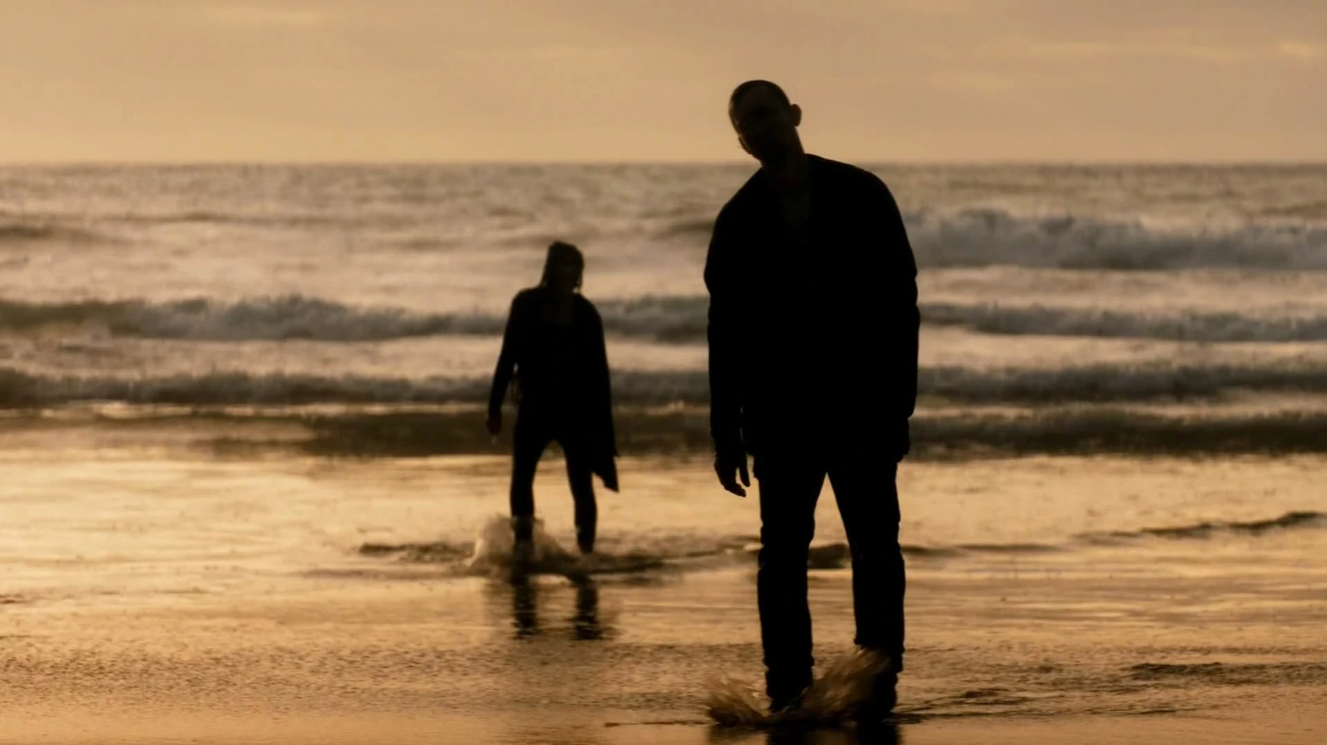On a beach, two of the dead wade out of the sea after they've been washed up there. Two children turn up and play, they both look about 5 or 6 years old; they don't seem to see the dead.