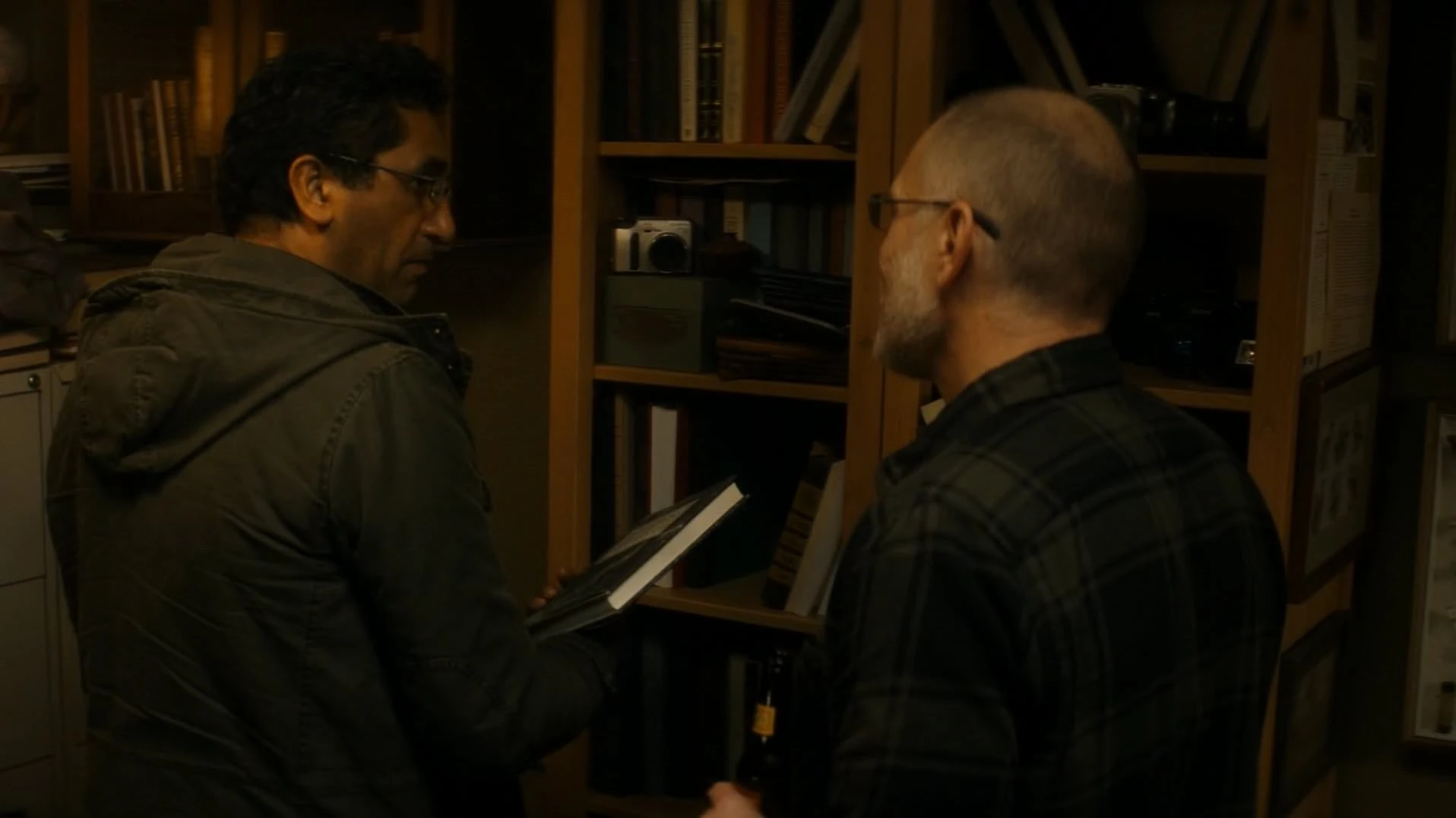 Inside, Travis is looking at George's bookshelves. George offers him a beer and says Travis is welcome to take a book. Travis says he doesn't have time to read, George tells him that now they have nothing but time. Travis takes a book.